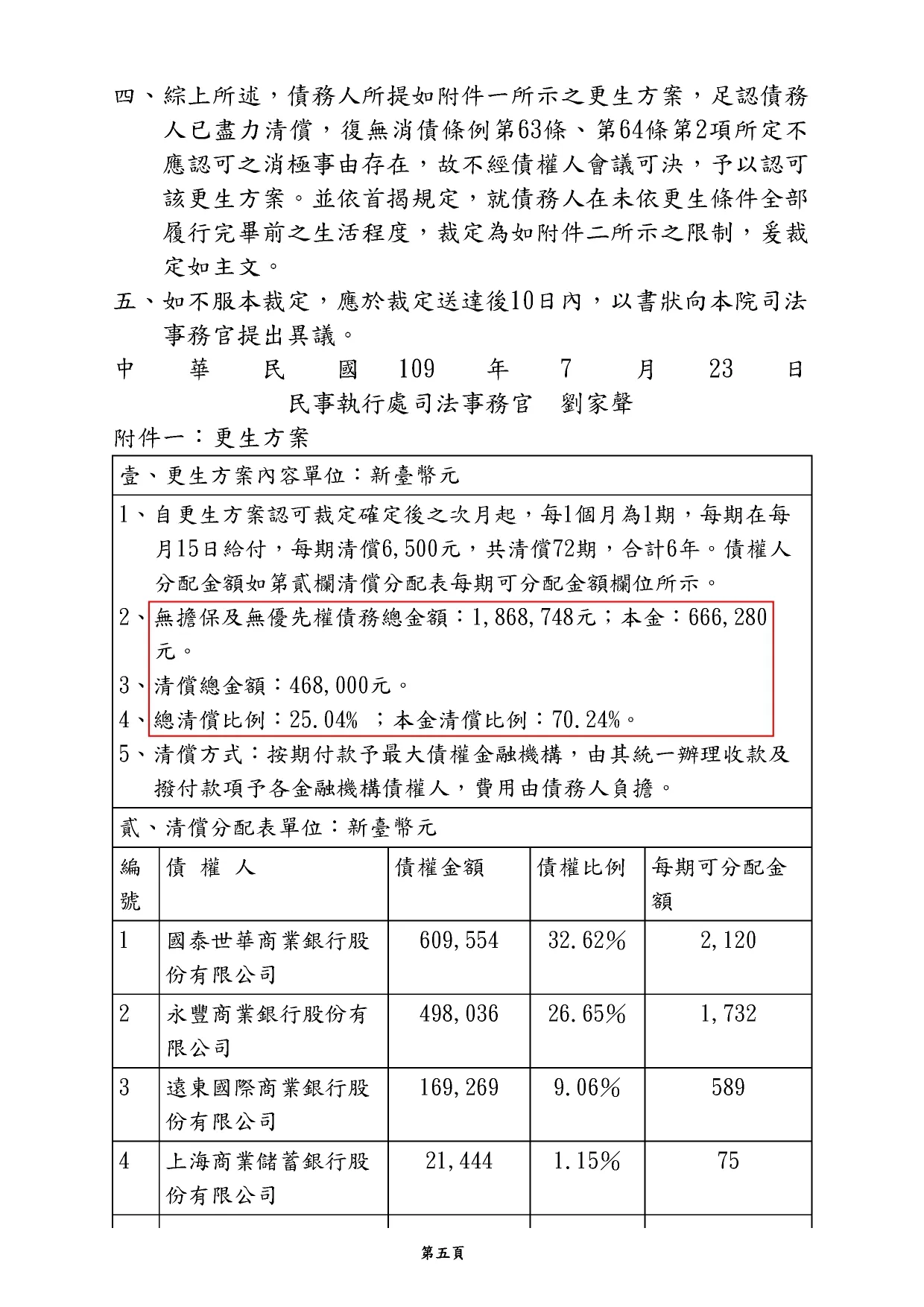 當事人積欠無擔保債務187萬元,與律師討論並經律師專業分析,向法院聲請更生,成功爭取法院裁定認可更生方案,總清償金額46萬元,清償比例25.04%。
