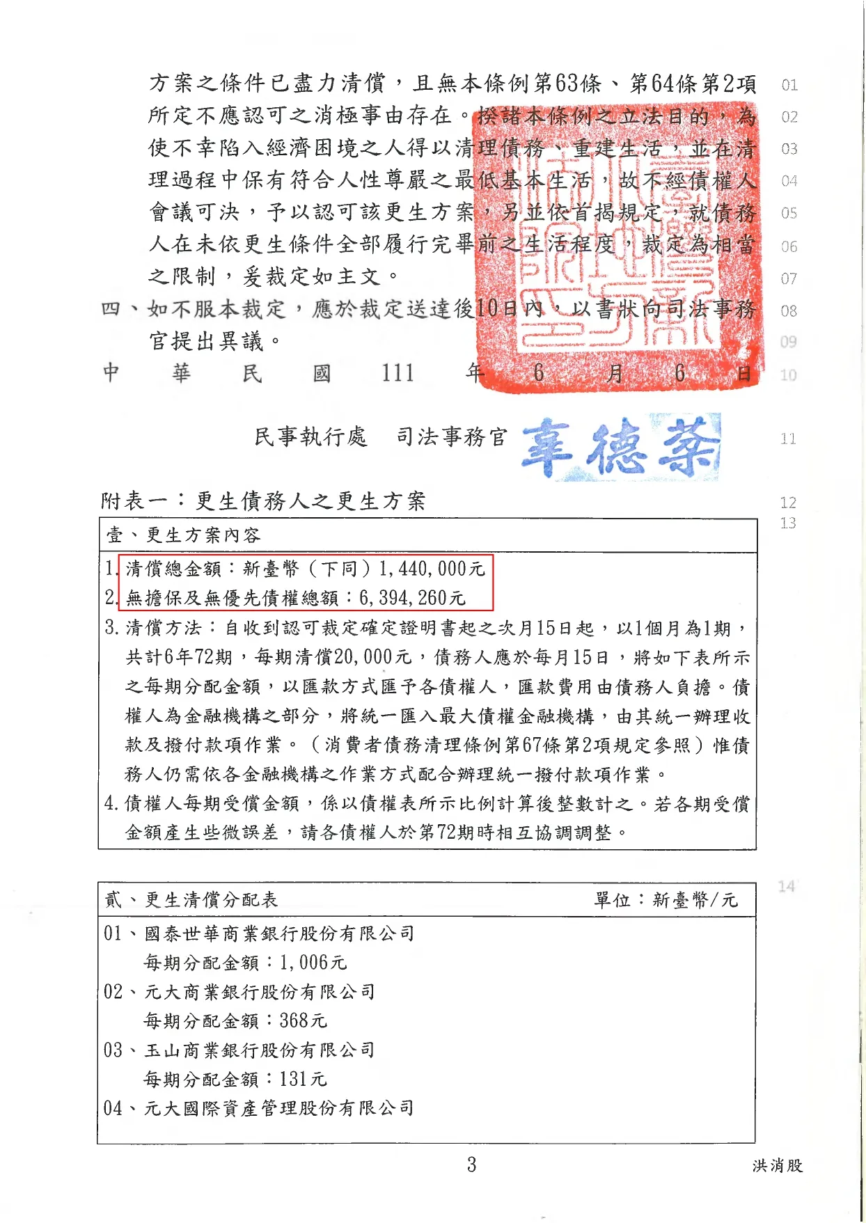 當事人積欠無擔保債務640萬元,與律師討論並經律師專業分析,向法院聲請更生,成功爭取法院裁定認可更生方案,總清償金額144萬元,清償比例22.52%。